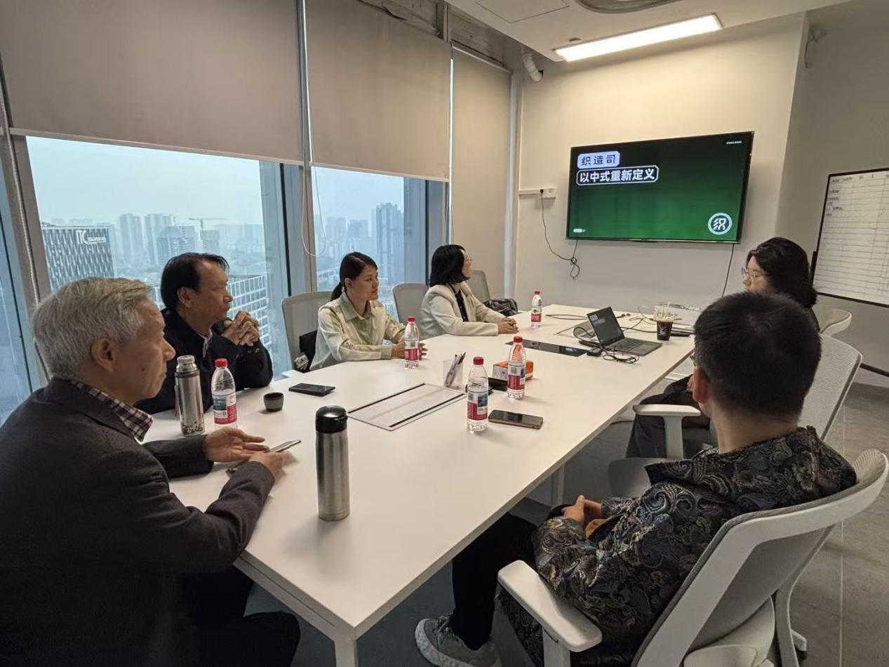 图:教师团队与公司代表在会议室进行座谈交流的场景