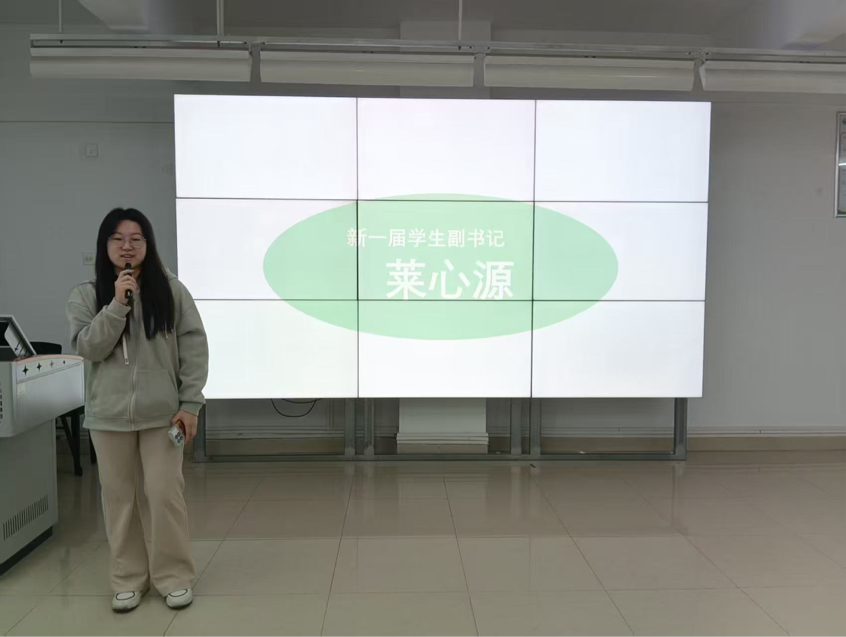 接下来,新一任院团委学生副书记莱心源进行发言。她对新任干事提出三个要求:一是筑牢思想根基,结合公治院专业特色开展理论学习活动;二是搭建实践桥梁,联动校团委及校外资源,让青春在实践中闪光;三是强化服务意识,倾听同学们的需求,优化活动形式,让团委成为有温度、有活力的集体。最后她希望干事们在组织活动中提升能力,在服务他人中实现价值,共同为学院团委的发展出谋划策!